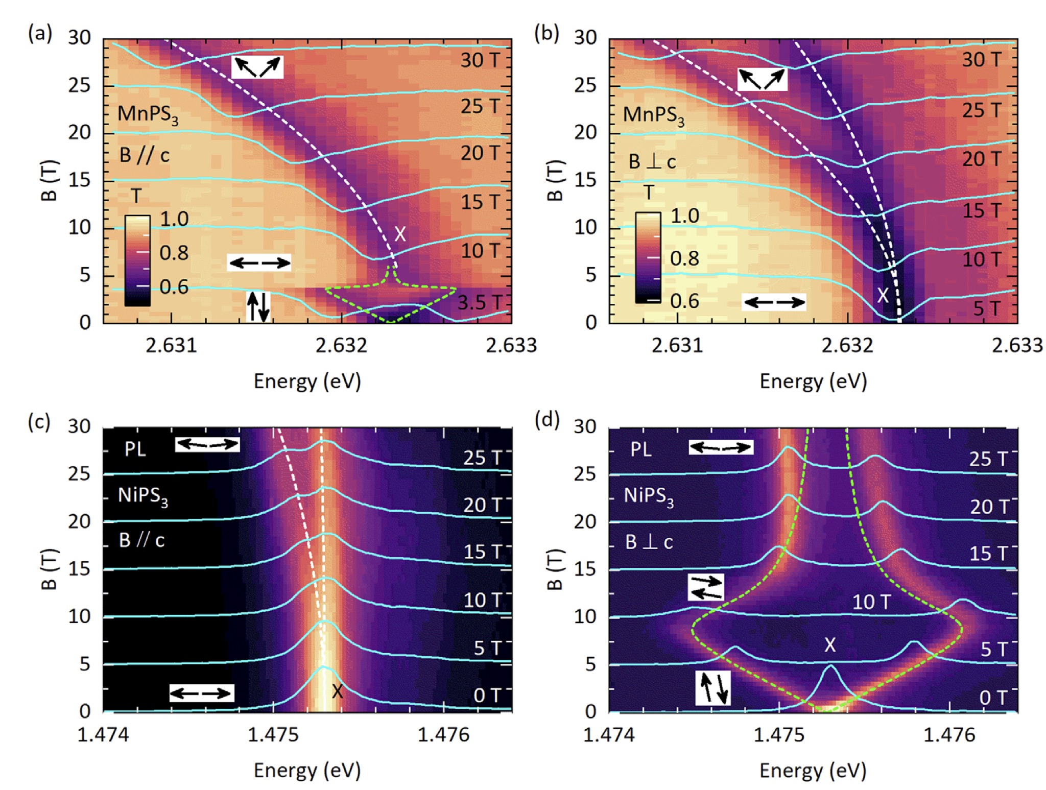 Fig. 4. Heat map of the change PL intensity with application of a magnetic-field B. The shift in peak intensity is indicated by the dashed white line. Left figures are drawn for B normal to the plane; right for B in plane. Top figures are for MnPS3, and bottom ones are for NiPS3. Note that panels (a) and (d) the field is parallel to the 0-field magnetization, while B is perpendicular to it. The small insets with the arrows show how the magnetization evolves with B in the various cases.