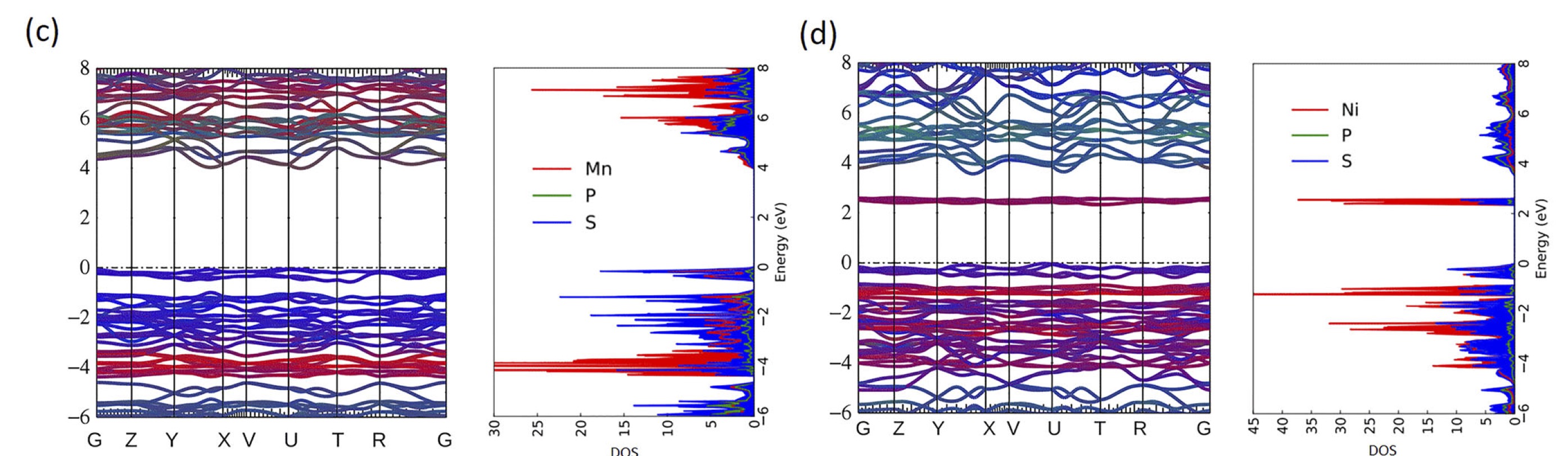 The magnetic structure is depicted in Fig. 1 as red arrows. While both compounds are antiferromagnetic (AFM), the spins are aligned perpendicular to the plane for MnPS3, and in the plane for NiPS3. By applying fields both in-plane and out-of-plane we can extract the exchange interactions J and magnetocrystalline anisotropy D, as we show below). The magnetic configurations differ in another important respect. The Mn d shell takes a d 5 configuration: thus its majority-spin d states are filled while its minority states are empty. This implies that there can be no transition between occupied and unoccupied d states without a spin flip (Fig 1c). Ni takes a d 8 configuration, with all 6 t2g states in the two spin channels filled, and the remaining eg state filled in one channel but empty in the other (Fig 1d). This configuration admits both spin-conserving transitions and spin-flip transitions. As the Mn moment is approximately 5, while the Ni moment is close to 2, Mn has a larger internal effective magnetic field, so the Zeeman splitting between occupied and unoccupied states is much larger. Roughly the occupied-unoccupied splitting is given by I×M, where I is the Stoner parameter (about 1 eV in 3d transition metals) and M the magnetic moment. This is reflected in the band structure and density-of-states (Fig. 2). They are calculated within a self-consistent form of ab initio many-body perturbation theory, using the quasi-particle self-consistent GŴ approximation (QSGŴ). QSGŴ is an extension of the quasi-particle self-consistent GW approximation (QSGW) where electronic eigenfunctions are computed in the presence of the screened Coulomb interaction corrected by the excitonic vertex. QSGŴ generally yields very accurate one-particle spectra, so this theory is expected to provide a reliable estimate for the one-particle gap.