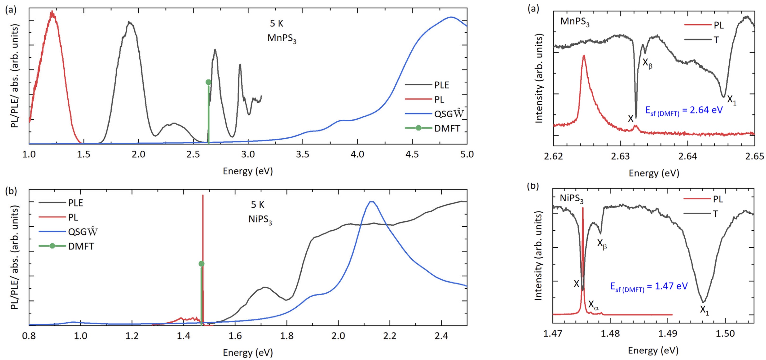 Fig. 3. Photoluminesence and photoluminesence excitation spectra, together with dielectric response computed within MBPT and DMFT. Top and bottom panels are for MnPS3 and NiPS3, respectively. Left: over a wide energy window; Right: a small window focusing on the sharp peak that we identify as a spin-flip transition.