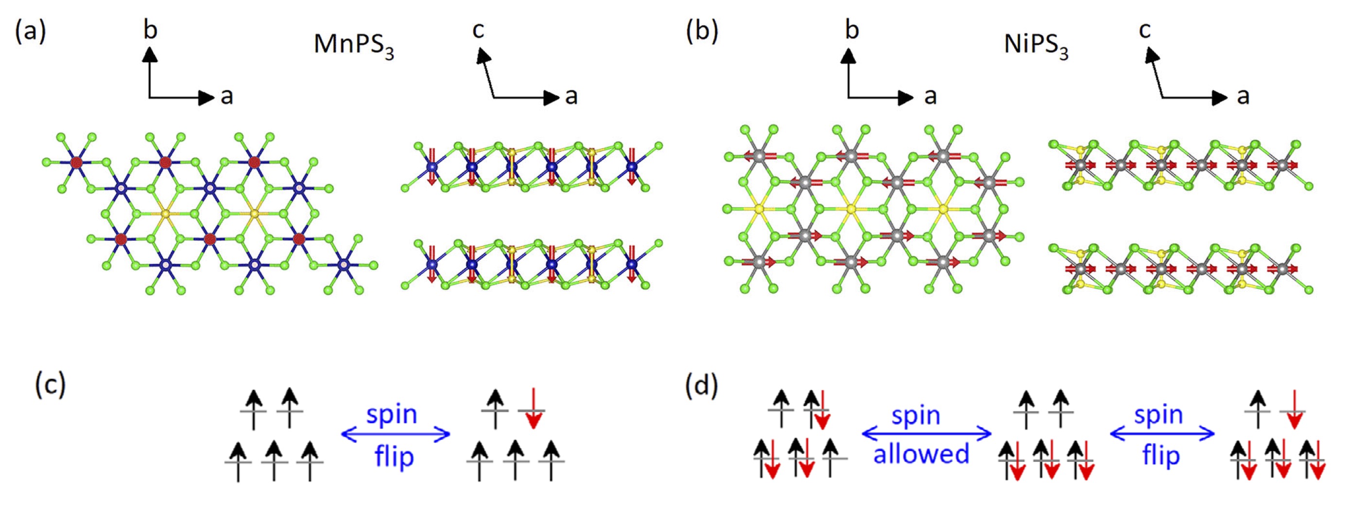Fig. 1. (a) lattice structure of MnPS3 in the ab plane, and a side view normal to the plane. (b) Same for NiPS3. Blue/gray/ green/yellow spheres represent manganese/nickel/ sulfur/phosphorus atoms. Panels (c) and (d) show the spin configuration before and after a d-d excitation.
