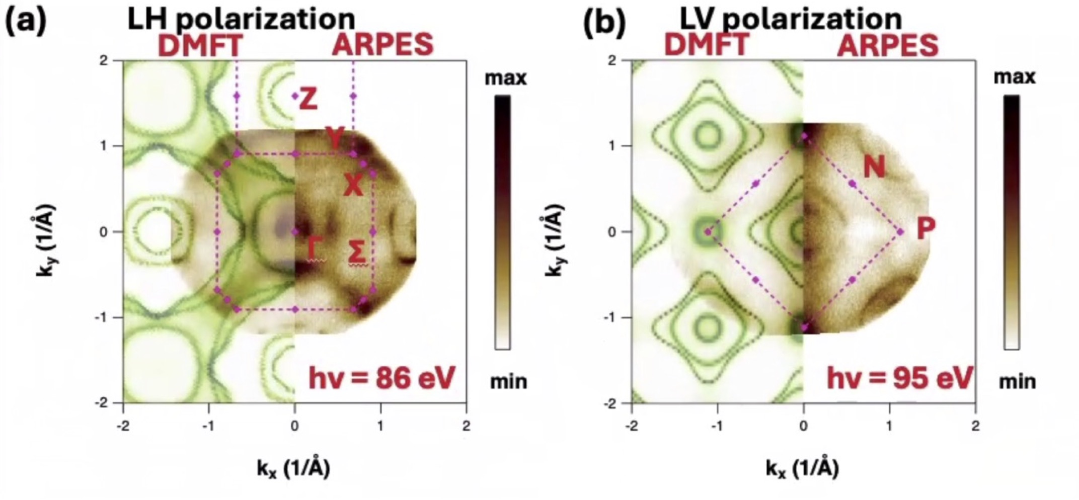 Fig. 1. Experimental Fermi surfaces in brown overlaid on the left-half with partially transparent theoretical Fermi surfaces in green calculated using QSGW+DMFT. (a) Z–X–Γ plane measured with hv = 86 eV and LH (linear horizontal) polarization and (b) through the P-N plane measured with LV (linear vertical) polarization and hv = 95 eV. Two pockets around the origin are observed in ARPES. DMFT shows a third, outer pocket, but the symmetry precludes it being picked up by LV polarization.