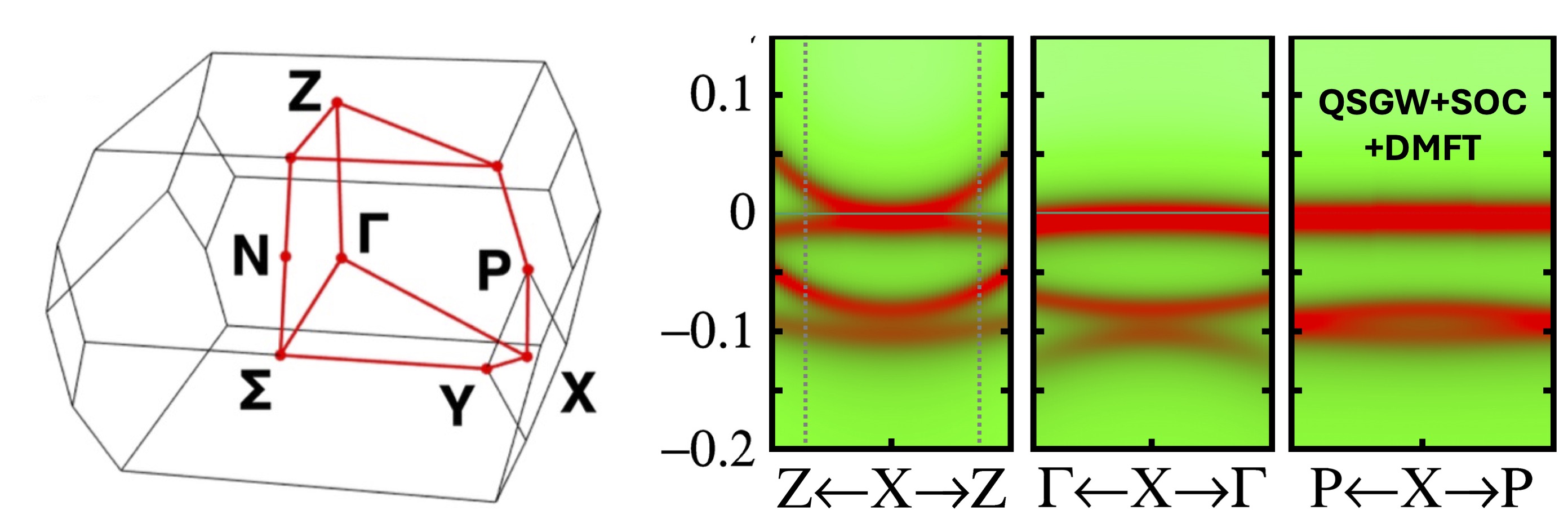 With the theory we can readily explore spectral functions in other directions (Fig. 3). It turns out that dispersions in other directions are quite different: along the X-Z line, the curvature of one of the two bands changes sign; along the X-P line, the bands become almost entirely flat.