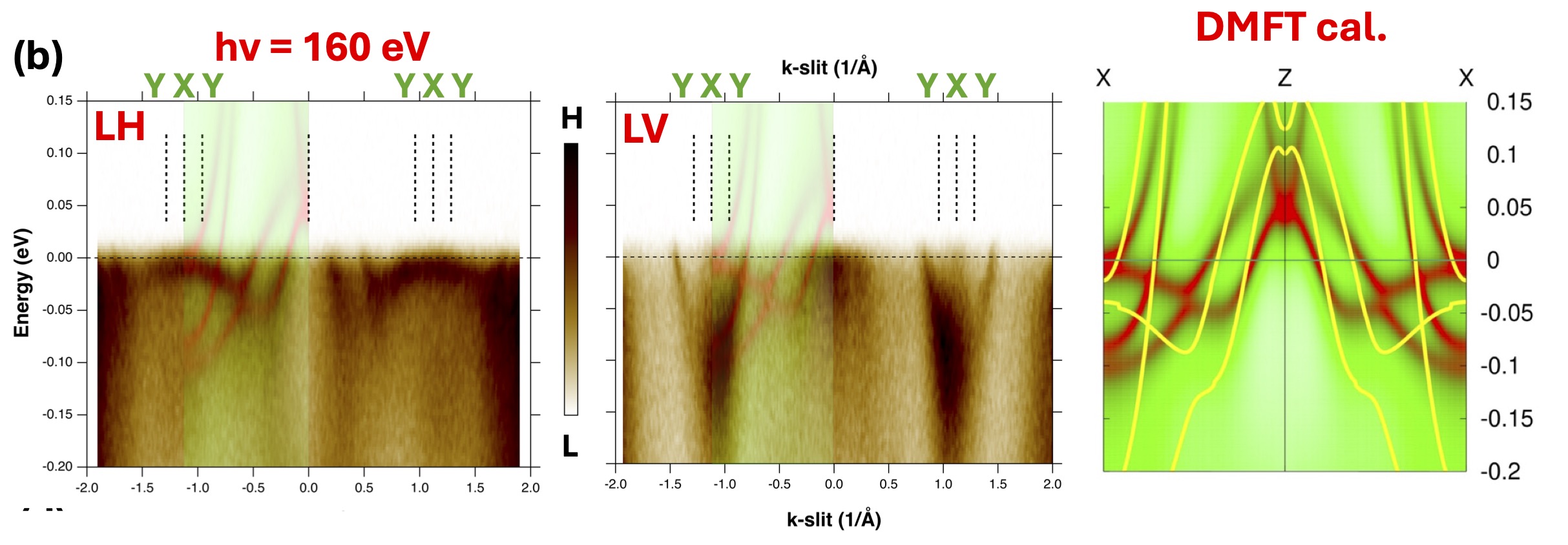 Fig. 2. ARPES spectra on the X–Y–Z–Y–X line in LH polarization and LV polarizations. DMFT calculations are superimposed using semitransparent green-red color map in the showcasing the excellent agreement between theory and experiment. Right shows the DMFT calculations (red-green color map) in comparison to the QSGW calculations (yellow) upon which the DMFT calculations are based. Bands cross the Fermi level are at similar implying that QSGW and DMFT Fermi surfaces are similar. The QSGW Fermi velocities are roughly twice as large as those in DMFT (and by extension, the experimental) velocities.