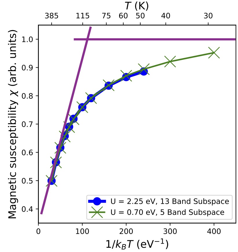 Fig. 4. Calculated on-site static spin susceptibility (the expectation value at one site) as a function of temperature as calculated by DMFT. DMFT was calculated for physically realistic values of Hubbard parameters U and J, and for some small values as well to reach lower temperatures. The behavior is only weakly dependent on the choice of U and J. It shows a transition from Curie-Weiss behavior () to Pauli behavior () at low temperature with the crossover (Kondo) temperature of ∼100 K. The and limits are illustrated with purple lines drawn as a guide.
